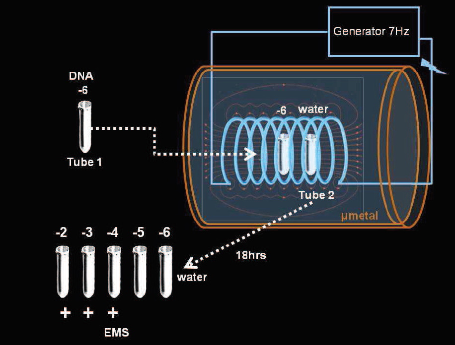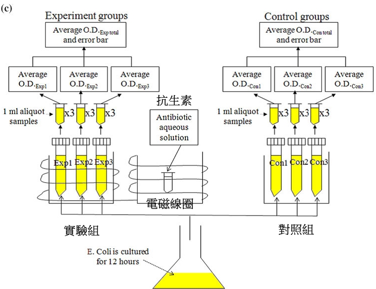 從下面實驗設計圖中,可以看到中間的杯子是放抗生素的液體,電磁線圈的設計,是要從中間的杯子把抗生素的訊號擷取後,透過低頻脈衝電磁場(low-frequency pulse electromagnetic field)把抗生素的訊號傳送到左邊實驗組的杯子,左邊的杯子裡面放有大腸桿菌E. coli的培養瓶,外面圍繞電磁線圈連結中間的杯子。右邊的杯子是對照組裡面放有大腸桿菌E. coli的培養瓶,但是沒有電磁線圈圍繞。