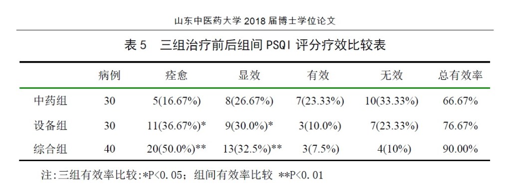 由上表可知,治療八周後,中藥組PSQI評分療效臨床痊癒率16.67%,顯效率26.67%,有效率23.33%,無效率33.33%,總有效率66.67%。設備組臨床痊癒率36.67%,顯效率30.0%,有效率10.0%,無效率23.33%,總有效率76.67%。綜合組臨床痊癒率50.0%,顯效率32.5%,有效率7.5%,無效率10.0%,總有效率90.0%。在總有效率方面之比較,設備組高於中藥組10%,其主要原因是設備組的無效率比中藥組低10%。另外,設備組在痊癒與顯效的比例則明顯高於中藥組。若以三組進行比較,綜合組無論在總有效率,或無效率兩項指標都明顯優於其他兩組。尤其是痊癒率及顯效率均非常顯著的優於其他兩組。反之,在無效率方面,綜合組則明顯低於其他兩組。這結果提示低頻率共振電刺激儀與中藥結合治療頑固性失眠症較單純中藥,或單獨使用設備的臨床療效好,治癒率高,且臨床獲效所需時間也比較短。
