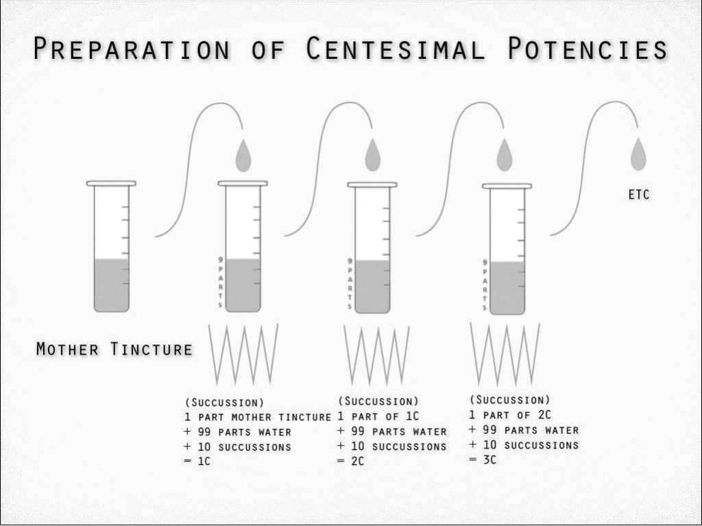 跟中醫的正治概念有點像,不過各自的理論不太一樣。順勢療法的藥劑製備是利用稀釋震盪的原理,把草藥裡面的生物訊息轉移到水裡面,只要喝水就會跟吃這個草藥有一樣的效果。
