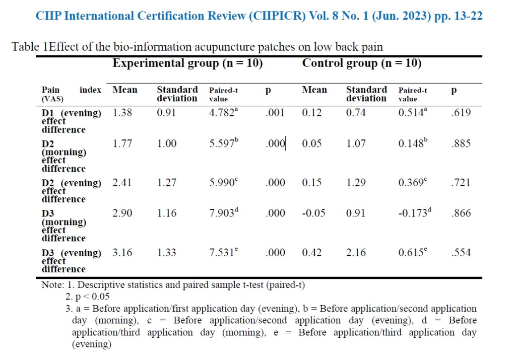 本研究主要結果歸納如下:(1)試驗者在不知道有無生物訊息的情況下,有無生物訊息對於疼痛改善在統計上有非常明顯的差異。(2)生物訊息對下背痛的疼痛指數於貼敷第二日即有顯著改善,三日後疼痛平均數僅剩不到1。有生物訊息的個案自覺不適之症狀有明顯改善,無生物訊息的個案症狀則明顯無感,代表生物訊息作用速度快而且精準(3)在有效性分析上,有生物訊息的實驗組達到90%的有效率,有效率非常高,遠超過安慰劑效應,代表生物訊息的作用明顯。(4)無生物訊息的對照組只有20%的有效率,低於安慰劑效應,代表在病理性的疼痛下,安慰劑效應並不明顯。